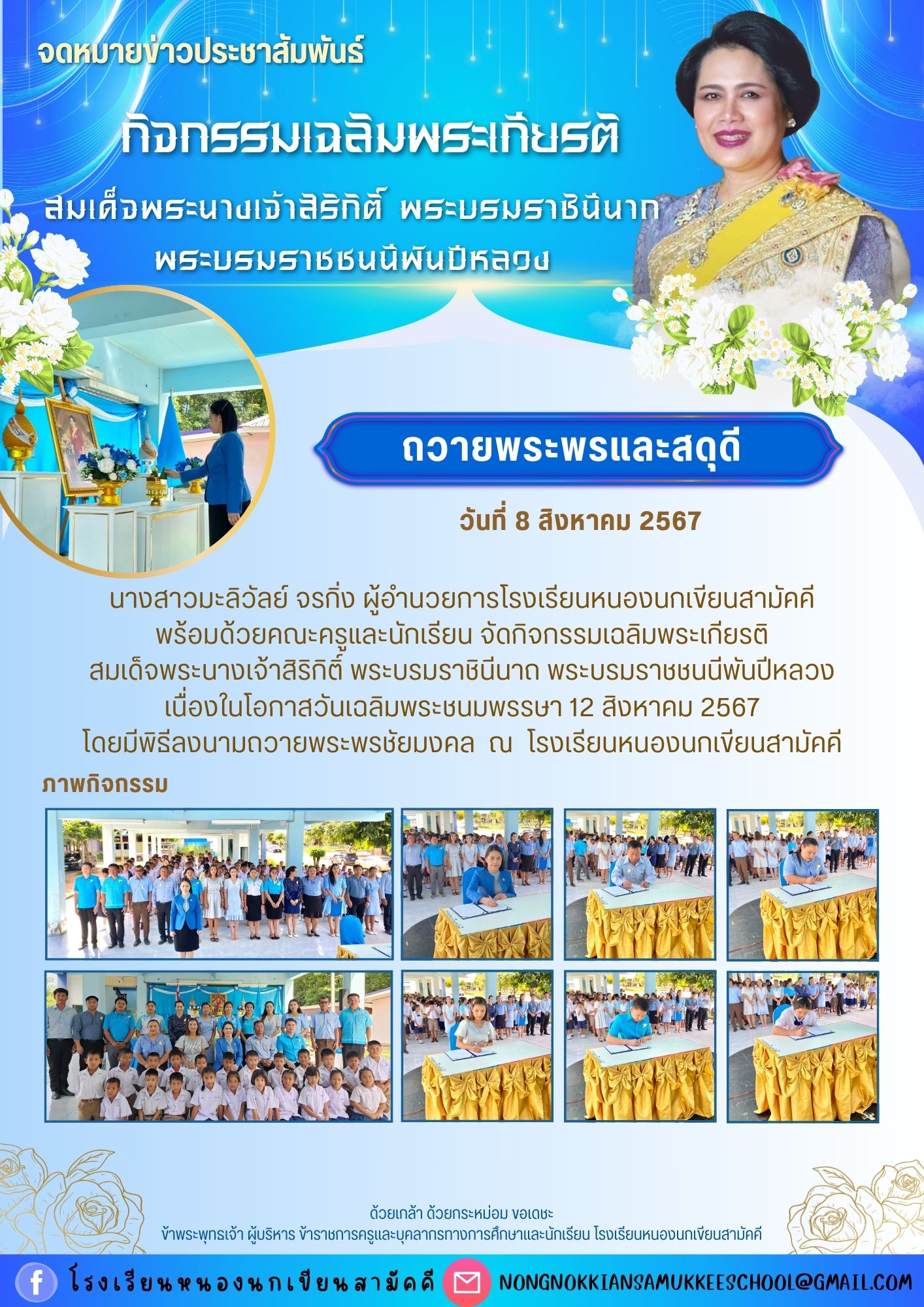 นางสาวมะลิวัลย์ จรกิ่ง ผู้อำนวยการโรงเรียนหนองนกเขียนสามัคคี พร้อมด้วยคณะครูและนักเรียน จัดกิจกรรมเฉลิมพระเกียรติ สมเด็จพระนางเจ้าสิริกิติ์ พระบรมราชินีนาถ พระบรมราชชนนีพันปีหลวง เนื่องในโอกาสวันเฉลิมพระชนมพรรษา 12 สิงหาคม 2567 โดยมีพิธีลงนามถวายพระพรชัยมงคล ณ โรงเรียนหนองนกเขียนสามัคคี