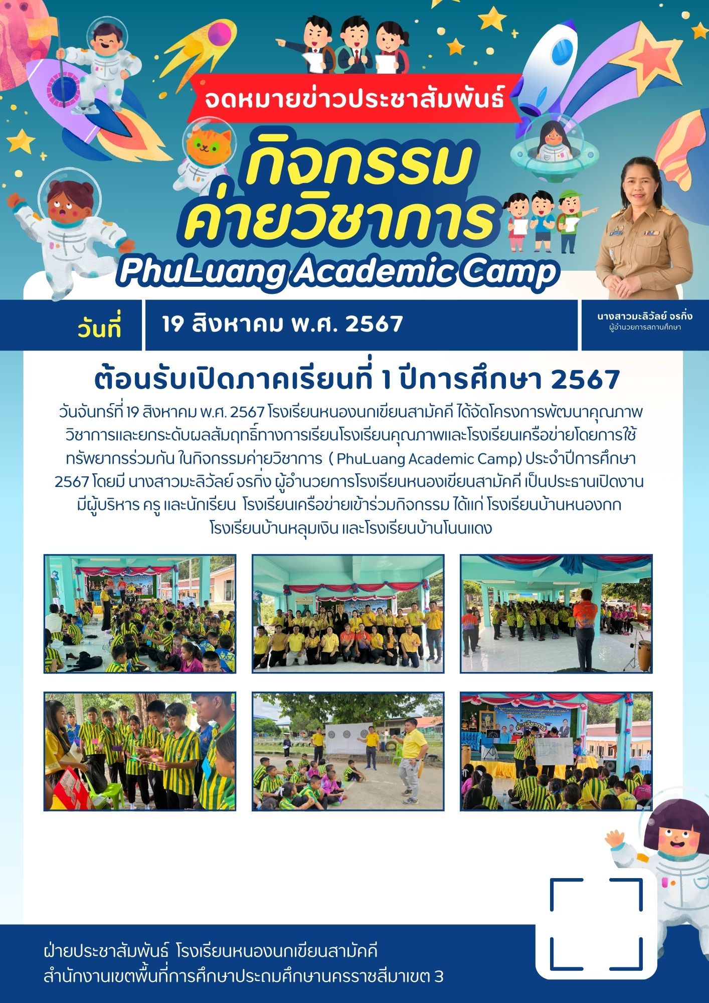 วันจันทร์ที่ 19 สิงหาคม พ.ศ. 2567 โรงเรียนหนองนกเขียนสามัคคี ได้จัดโครงการพัฒนาคุณภาพวิชาการและยกระดับผลสัมฤทธิ์ทางการเรียนโรงเรียนคุณภาพและโรงเรียนเครือข่ายโดยการใช้ทรัพยากรร่วมกัน ในกิจกรรมค่ายวิชาการ ( PhuLuang Academic Camp) ประจำปีการศึกษา 2567 โดยมี นางสาวมะลิวัลย์ จรกิ่ง ผู้อำนวยการโรงเรียนหนองเขียนสามัคคี เป็นประธานเปิดงาน มีผู้บริหาร ครู และนักเรียน โรงเรียนเครือข่ายเข้าร่วมกิจกรรม ได้แก่ โรงเรียนบ้านหนองกก โรงเรียนบ้านหลุมเงิน และโรงเรียนบ้านโนนแดง