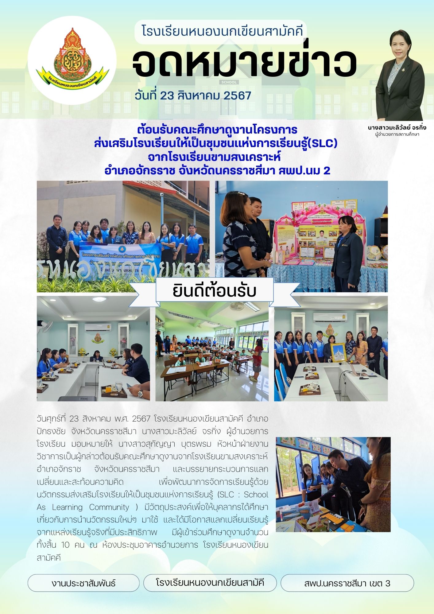 วันศุกร์ที่ 23 สิงหาคม พ.ศ. 2567 โรงเรียนหนองเขียนสามัคคี อำเภอปักธงชัย จังหวัดนครราชสีมา นางสาวมะลิวัลย์ จรกิ่ง ผู้อำนวยการโรงเรียน มอบหมายให้ นางสาวสุกัญญา บุตรพรม หัวหน้าฝ่ายงานวิชาการเป็นผู้กล่าวต้อนรับคณะศึกษาดูงานจากโรงเรียนขามสงเคราะห์ อำเภอจักราช จังหวัดนครราชสีมา และบรรยายกระบวนการแลกเปลี่ยนและสะท้อนความคิด เพื่อพัฒนาการจัดการเรียนรู้ด้วยนวัตกรรมส่งเสริมโรงเรียนให้เป็นชุมชนแห่งการเรียนรู้ (SLC : School As Learning Community ) มีวัตถุประสงค์เพื่อให้บุคลากรได้ศึกษา เกี่ยวกับการนำนวัตกรรมใหม่ ๆ มาใช้ และได้มีโอกาสแลกเปลี่ยนเรียนรู้จากแหล่งเรียนรู้จริงที่มีประสิทธิภาพ มีผู้เข้าร่วมศึกษาดูงาน จำนวนทั้งสิ้น 10 คน ณ ห้องประชุมอาคารอำนวยการ โรงเรียนหนองเขียนสามัคคี
