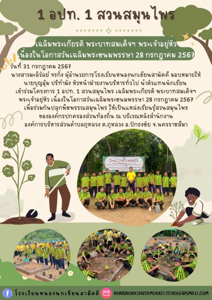 นางสาวมะลิวัลย์ จรกิ่ง ผู้อำนวยการโรงเรียนหนองนกเขียนสามัคคี มอบหมายให้ นายบุญอุ้ม ปริทำมัง หัวหน้าฝ่ายงานบริหารทั่วไป นำตัวแทนนักเรียนเข้าร่วมโครงการ 1 อปท. 1 สวนสมุนไพร เฉลิมพระเกียรติ พระบาทสมเด็จฯ พระเจ้าอยู่หัว เนื่องในโอกาสวันเฉลิมพระชนมพรรษา 28 กรกฎาคม 2567 เพื่อร่วมกันปลูกพืชพรรณสมุนไพร ให้เป็นแหล่งเรียนรู้สวนสมุนไพรขององค์กรปกครองส่วนท้องถิ่น ณ บริเวณหลังสำนักงานองค์การบริหารส่วนตำบลภูหลวง ต.ภูหลวง อ.ปักธงชัย จ.นครราชสีมา